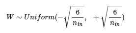 - 이전 층의 뉴런 개수 nin, 다음 층의 뉴런개수 nout이 있을 때 다음과 같은 분포를 사용하여 가중치를 초기화 한다.