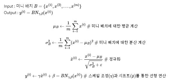 Batch Normalization : 인공 신경망의 각 층에 들어가는 입력을 평균과 분산으로 정규화하여 학습을 효율적으로 만들어준다. 즉, 한 번에 들어오는 batch 단위로 정규화 하는 것. 평균을 0으로 만들고 정규화를 한다. 그리고 정규화 된 데이터에 대해 scail(매개변수 사용)과 shift(매개변수 B 베타 사용)를 수행한다.