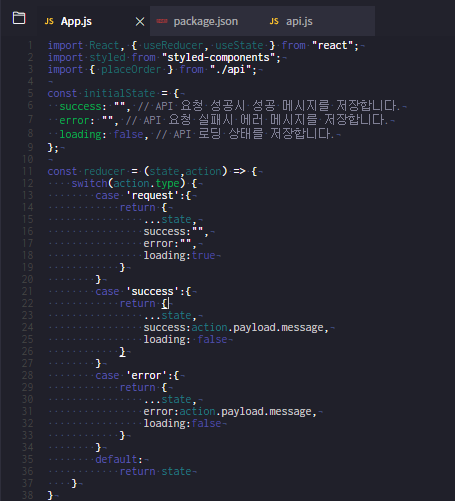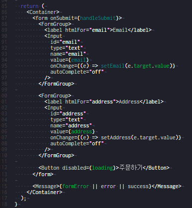 또한 async function 내에 await axios.post / get / delete 등을 할 때 try { await axios.어쩌구 } catch { setFail('에러메세지') } 를 해서 try에는 하고자하는 비동기작업, catch 에는 실패했을 경우 를 적어주면 좋다.