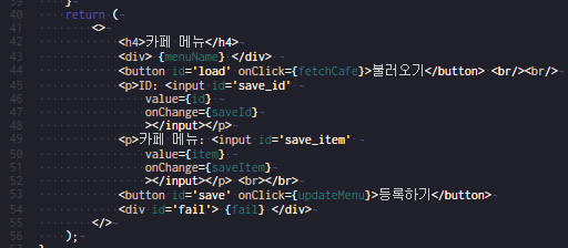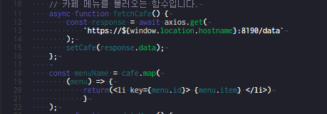 또한 여기서 불러오기를 누르면 출력되는 menuName을 통해 cafe는 배열이고, [{ 'id': 1, 'item': '아메리카노'}, { 'id': 2, 'item': '카라멜마키아토' }] 와 같은 메뉴들이 모인 모양임을 알 수 있다.