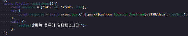 updateMenu 시 post해줄 애로 바로 id와 item을 집어넣으면 안되고, response.data의 모양에 맞게 { 'id': __ , 'item': __ }형식으로 넣어줘야 한다. 그래서 newMenu를 선언했다. 거기에 여태까지 input으로 setValue해준 id와 item을 넣어준다.
