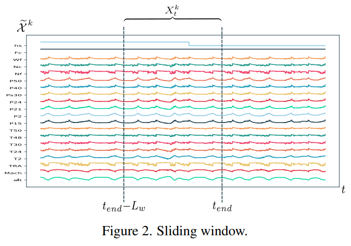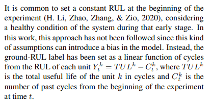 초기에는 기계가 건강한 상태일 것이라 생각하여 실험 시작 시 일정한 규칙을 설정하는 것이 일반적이다(H. Li, Zhao, Zhang, Zio, 2020). 현재 우리 논문에서, 이러한 종류의 가정은 모델에 편견을 도입할 수 있기 때문에 이 접근법은 사용하지 않았다. 대신, ground-RUL 라벨은 각 단위 Ykt(=unit k 의 t시점일 때 RUL) = TULk - Ctk