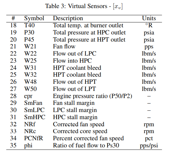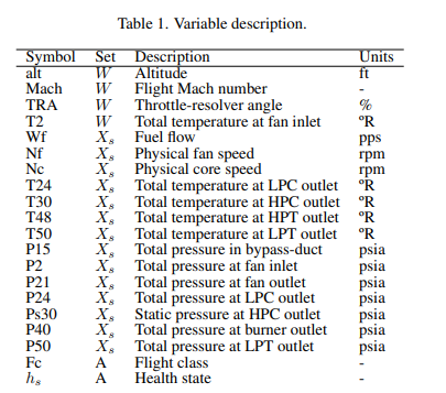 표 2 ~ 4는 데이터 세트의 각 입력 변수의 이름, 설명 및 단위를 제공합니다. 변수 기호는 CMAPSS의 내부 변수 이름에 해당합니다. 설명 및 단위는 모델 설명서와 같이 보고됩니다.
