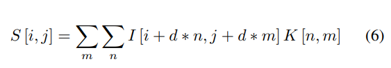 여기서 I는 입력 행렬이고, K는 크기 n x m의 커널=filter 행렬(또는 컨볼루션의 매개 변수)이며, d는 확장 속도이며, S는 피처 맵이라고 불리는 컨볼루션의 결과이다. 커널 매트릭스는 입력 매트릭스를 가로질러 미끄러져 그 어느 위치에나 존재하는 패턴을 찾는다. 따라서 FCN과 비교하여 가중치의 수가 감소하고 추가로 과적합 확률이 감소한다. 풀링 작업은 이전에 직사각형 풀링 영역으로 분할되었던 입력의 각 영역에 통계 연산을 적용하여 다운스케일링을 수행한다. 풀링 작업은 몇 가지 용도로 사용됩니다.