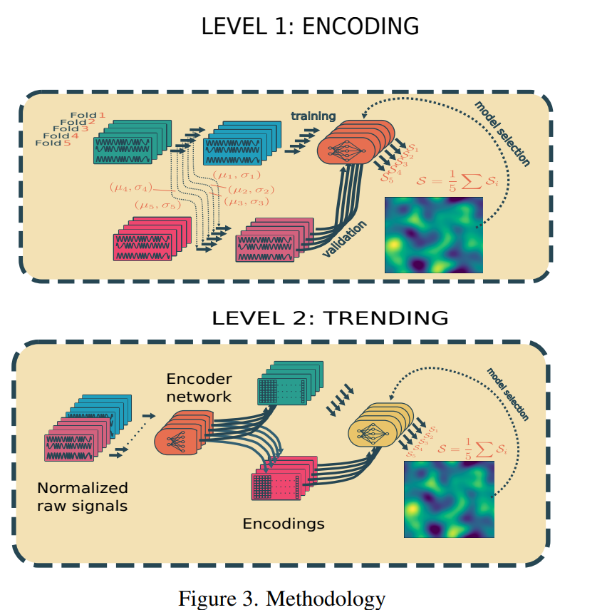 모델링 단계는 두 단계로 구성됩니다(그림 3 참조). 첫 번째 수준에서 목표는 raw input 신호의 time window 인코딩을 생성하는 좋은 모델을 찾는 것이다. 이 인코딩은 입력 데이터의 높은 차원 때문에 필요합니다.