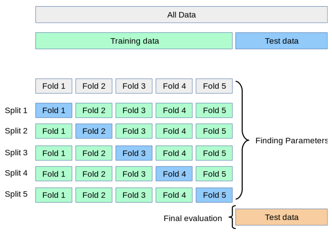 - 교차 검증은 train set을 train set + validation set으로 분리한 뒤, validation set을 사용해 검증하는 방식이다.