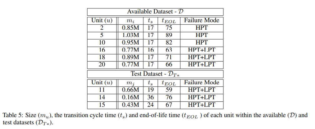 Table 5 : 데이터의 샘플링 속도는 1Hz이므로 교육을 위한 5.3M 샘플과 테스트를 위한 120M 샘플의 데이터 세트 총 크기가 된다. test unit 14는 비행시간(0.16M초)이 가장 적은 짧은 비행엔진이지만 비행주기 수가 가장 많다는 점은 주목할 만하다.