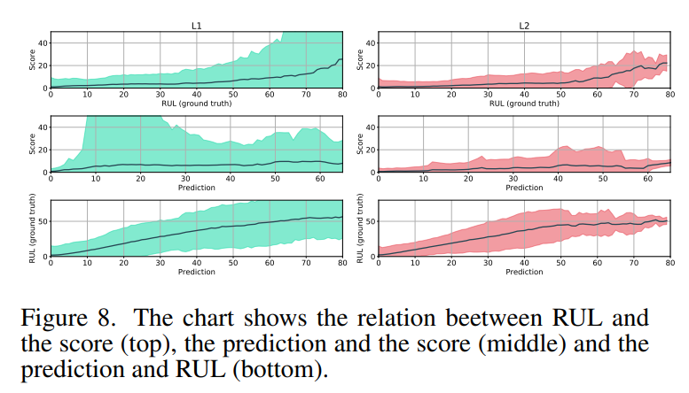 그림 8은 실측값 RUL(=ground truth RUL)과 각 stacked 모델에 의해 얻어진 점수 사이의 관계를 보여준다.