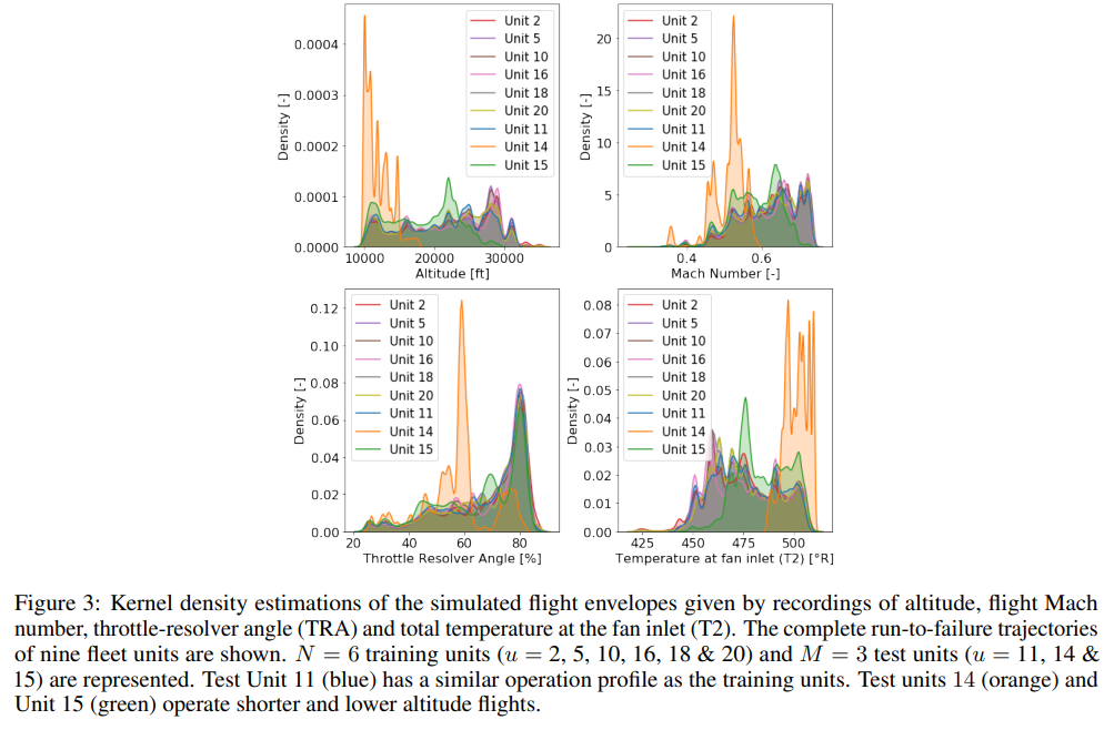 그림 3은 N = 6 training units(u = 2, 5, 10, 16, 18 & 20) 및 M = 3 test units(u = 11, 14, 15)에 대해 시나리오 변수 W: 고도(alt), 비행 마하 수(XM), 스로틀-레버 각도(TRA) 및 팬 입구(T2)의 총 온도(T2)에 의해 주어진 모의 비행 봉투의 커널 밀도 추정치를 보여준다. test units 14와 15는 training units와 유의하게 다른 작동 분포를 가지고 있다는 것을 주목할 필요가 있다. 구체적으로, test units 14와 15는 다른 장치들에 비해 더 짧고 더 낮은 고도 비행을 한다. 따라서 training units 세트에는 이 두 장치의 시험 조건에 대해 완전히 대표적이지 않은 비행 프로파일이 포함되어 있다.