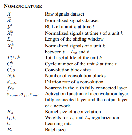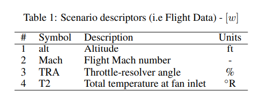 문제는 센서 출력 Xs, 시나리오 기술자 W 및 보조 데이터 A를 사용하여 시스템의 남은 유효 수명 Y를 예측할 수 있는 모델 G의 개발을 중심으로 전개된다. 시스템의 RUL을 추정하는 데 사용할 수 있는 다양한 변수는 표 1에 설명되어 있습니다. 전자는 다음 식과 같이 나타낼 수 있는 최적화 문제이다.