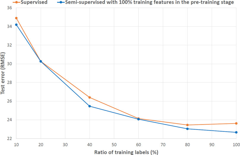 Semi-supervised learning은 fine-tuning 절차에서 레이블이 지정된 훈련 데이터가 감소할 때 supervised learning에 비해 더 높은 RUL 예측 정확도를 수행합니다. 준지도 학습은 학습 데이터가 100% 레이블링된 경우 지도 학습에 비해 더 높은 RUL 예측 정확도를 제공합니다. 이는 unsupervised pre-training 단계가 무작위로 초기화되는 가중치보다 더 적합한 로컬 최소값을 사용하여 가중치를 초기화한다는 것을 나타냅니다. 특히 훈련 레이블의 60% 이상이 포함된 경우 만족스러운 RUL 예측 정확도를 제공합니다. 즉 semi-supervised learning의 활용도는 다음과 같이 훈련 레이블의 40% 이상을 제거할 때 눈에 띄게 나타납니다.