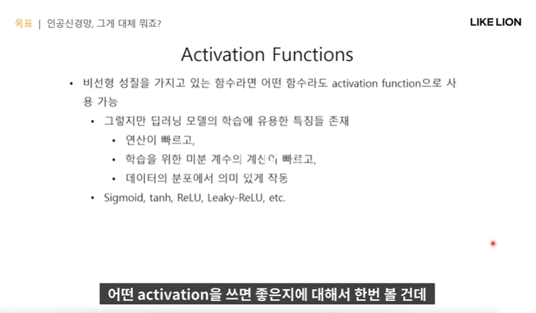 - activation function = 비선형성을주며 좀더 풍부한 표현을 가능하게