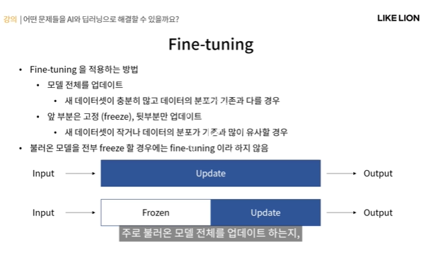 - 앞 부분은 고정, 뒷 부분만 업데이트(input쪽에 가까운 파라미터는 고정(freeze), 뒷부분만 업데이트) - 새 데이터셋이 적거나 데이터셋 분포가 기존과 비슷한 경우