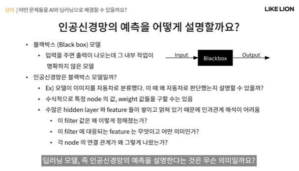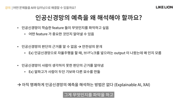 - 2. 안전성에서 문제 - 자율주행(모델이 잘못된 결과를 낸다면? 옳은 판단이었는지 분석할 수 없다. 보완이 불가능)
