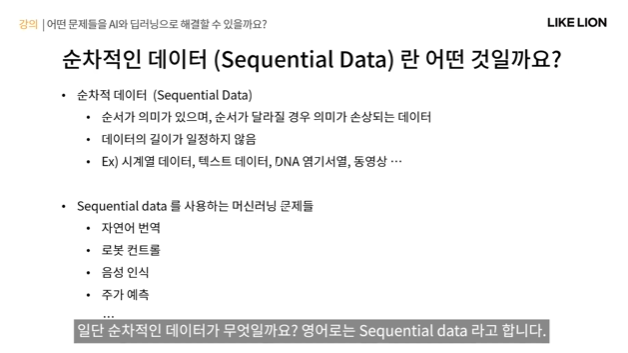 - 순차데이터: 순서가 의미 있는 데이터, 데이터 길이가 일정하지 않음. 시계열데이터, 사람의 말, RUL 등등, 염기서열, 동영상.. 단위로 나눌 수 있음 프레임별, 단어별, 시간별..