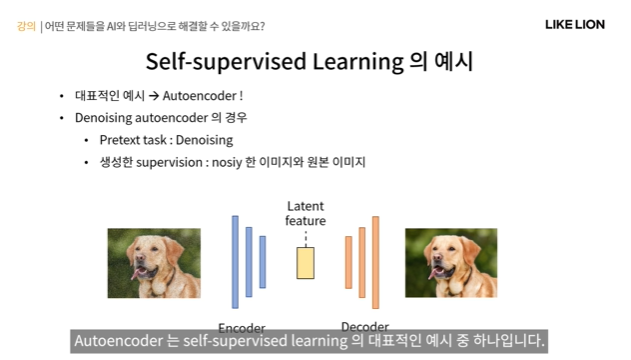 - label이 없는 데이터에 대해 스스로 supervision을 줘서 supervised learning처럼 학습하는 방법