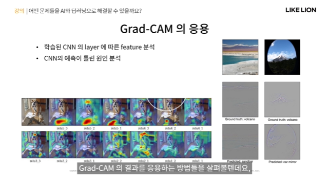 왼쪽 위쪽에 output에 가까운 layer, 오른쪽 아래가 input에 가까운 layer의 GradCAM이다.(low level feature)