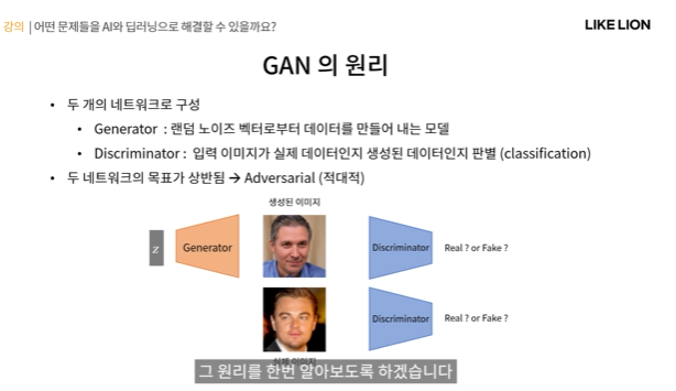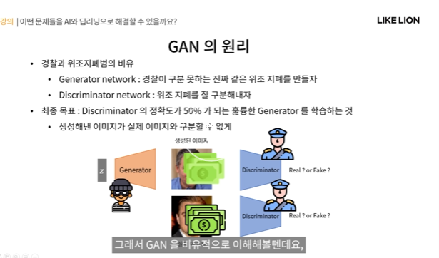 - 경찰 : 더 자세히 검사하게 됨. -> 서로 상반된 목표를 가지고 학습. 즉 좋은 generator를 만들어 내는 것이 목표.