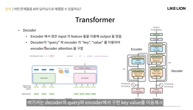 저 중간부분 그림에 주황색 파랑색 저게 K,V가 key,value인데 self attention을 통해 최종적으로 구해낸 key와 value를 가지고 decoder에서 나온 query와 비교를 해서 feature들을 구하고 최종적으로 output까지 구해내는 것.