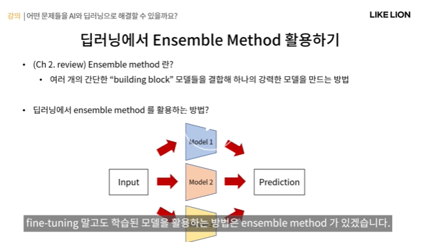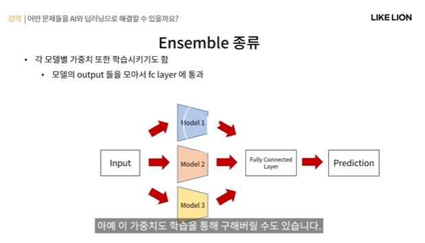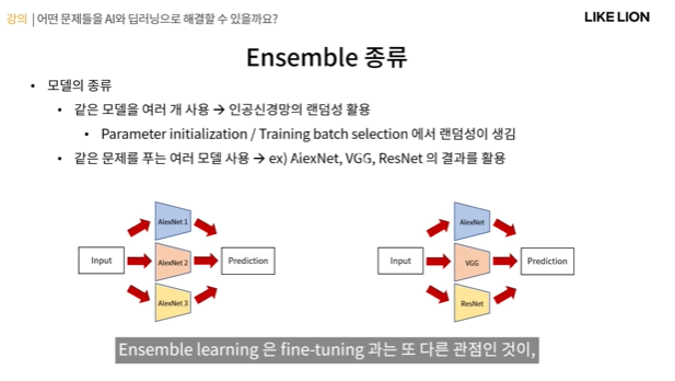 ensemble learning과 fine tuning과의 다른 점 : ensemble learning한다고 해서 엄청 성능이 오르진않고 약간 더 나아지는 정도인데 그에 반해 계산량이나 학습해야하는 모델은 많아지니 오히려 비효율적일 수도 있다.그럼에도 그 약간이라도 고르고 싶다.. 할때 쓴다.