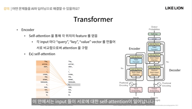 self attention : 같은 시퀀스 안에서 서로 연관된 부분을 찾아낸다. (The animal = it .. it 입장에서 봤을 때 sequence에서 The animal에 attention score 점수를 높게 준다는 것.)