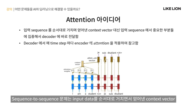 -> 입력 sequence에서 중요한 부분에만 집중해서 decoder에 바로 전달해줄 수 있게끔 하는 것 : Attention