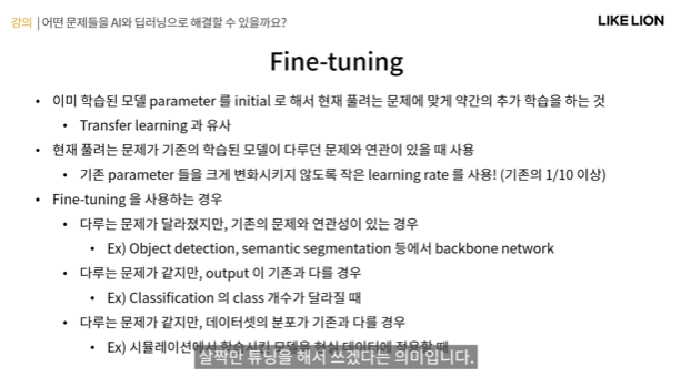 - 언제 사용? 현재 풀려는 문제가 기존의 학습된 모델이 다루던 문제와 연관이 있을 때(backbone 모델)