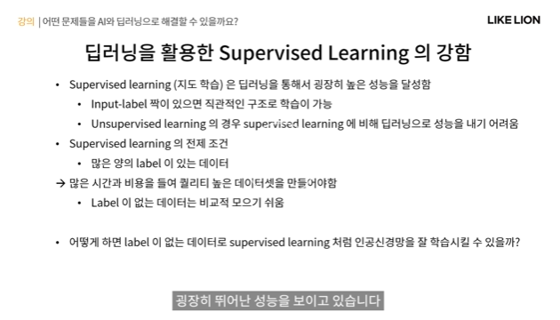 - 그런데 supervised learning은 할수만 있다면 괜찮은데 막대한 양의 label이 있는 데이터가 필요함.