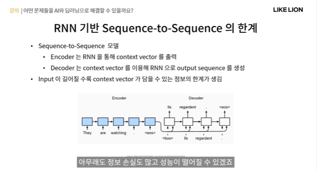 -> 문제점 : input sequence(하늘색부분)이 너무 길어진다면 모든 input에 대한 것을 RNN을 통해 인코딩해서 단 하나의 context vetor로 인코딩하고 그 하나를 바탕으로 decoder에서 output을 만드니까 정보 손실도 많고 성능도 떨어질 수 있다.