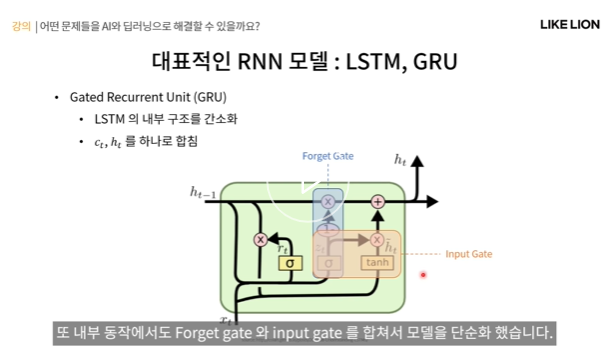 - c와 h가 hidden state하나로 합쳐짐, forget gate와 input gate를 합침.
