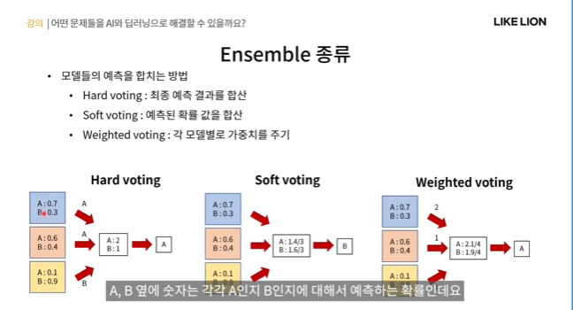 - weighted voting : 각 모델별로 가중치를 줌. 예를 들어 아래 그림에서 파랑모델에 가중치 2를 주면 0.7*2 + 0.6+0.1 / 4(=가중치의 합) 를 하는 거임. 단 가중치역시 하이퍼 파라미터임.