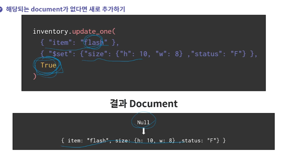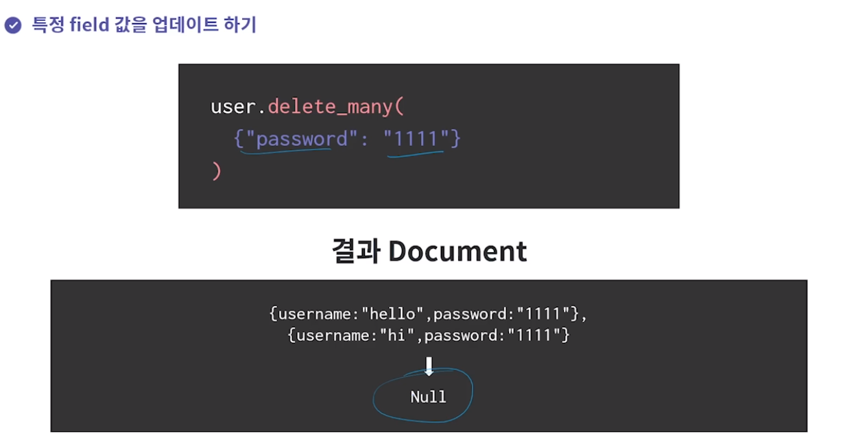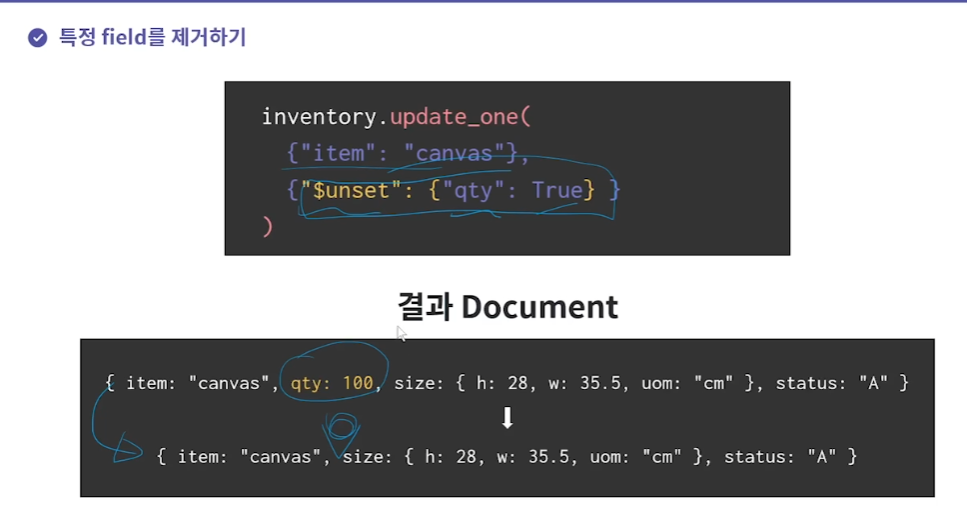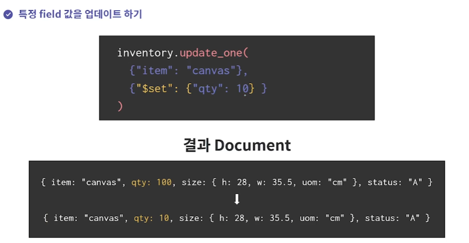 컬렉션명.update_one( {"$set":{해당필드명: 값}} )
