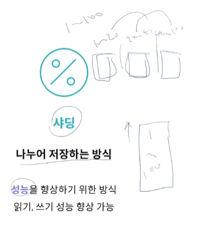 - 샤딩 1~20 20~40 40~100으로 나누어 저장, 서버 여러대에