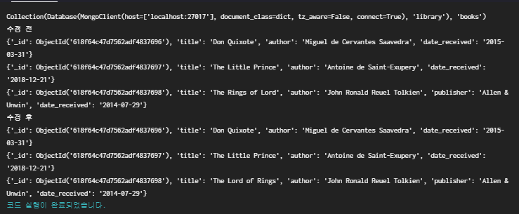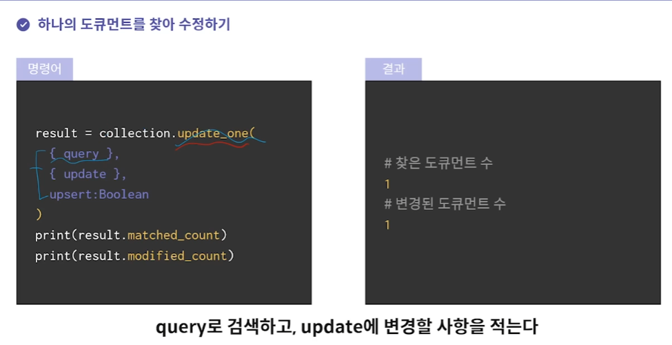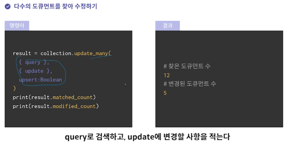 update내용과 query 내용을 매개변수로 update_many에 넣어준다.