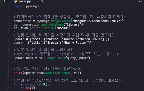 반면 수정할 데이터가 특정 문자열(해리포터)로 시작하는 도큐먼트들이기 때문에 정규표현식을 이용해야 합니다. 정규표현식을 이용하기 위해서는 $regex 연산자를 이용합니다.