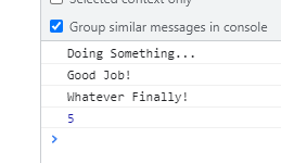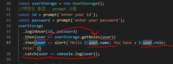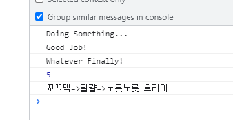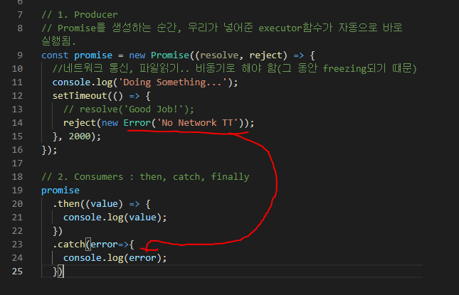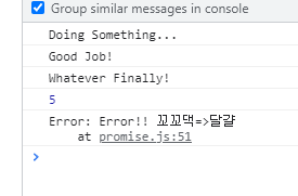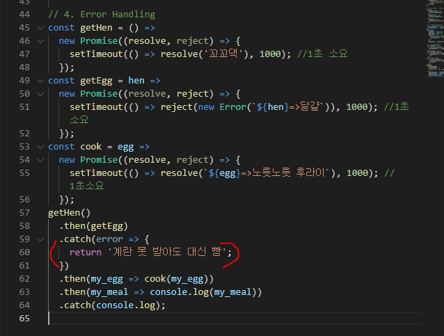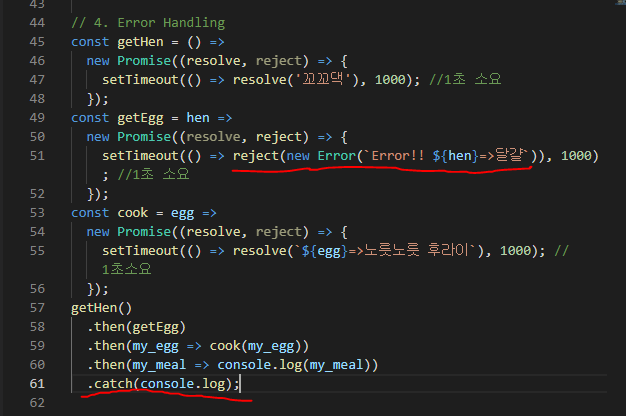 만약 중간에 달걀 가져오는 부분에서 reject로 에러가 나도, 마지막에 catch를 해주면 작업들이 연결되어 catch에서 에러를 띄울 수 있다.