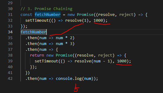 Chaning : promise.then()은 promise 자체를 return하게 되고, 그 return된 promise에 다시 한번 promise.catch()를 수행할 수 있다.