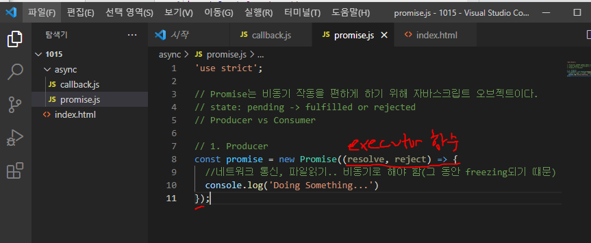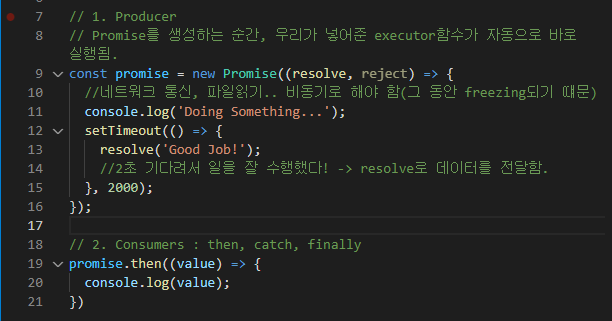 새로운 Promise가 만들어질 때, 우리가 전달한 executor = (resolve,reject)가 인자 라는 Callback 함수가 자동적으로 실행된다.