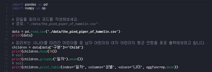 # 피리부는 사나이를 따라간 어린이들 중 남자 어린이와 여자 어린이의 평균 연령을 표로 출력해보려고 합니다.