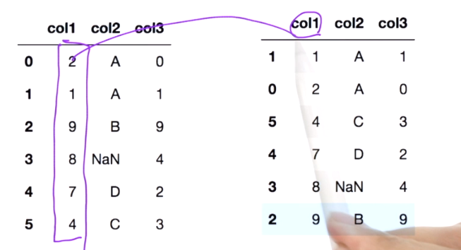 df.sort_values('col1') # col1의 컬럼값 기준으로 데이터를 정렬시킴