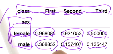 # 타이타닉 데이터에서 성별과 좌석별 생존률 구하기