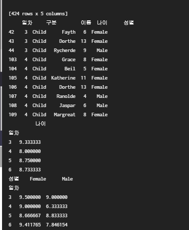 print(children.pivot_table(index='일차', columns='성별', values='나이', aggfunc=np.mean))