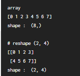 # Q1. array를 (2,4) 크기로 reshape하여 matrix에 저장한 뒤 matrix와 그의 shape를 출력해보세요.