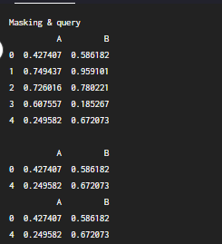 print(df.query('A < 0.5 and B > 0.3'))