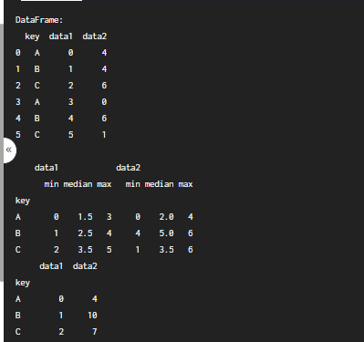 # 데이터 프레임을 'key' 칼럼으로 묶고, data1과 data2 각각의 최솟값, 중앙값, 최댓값을 출력하세요.