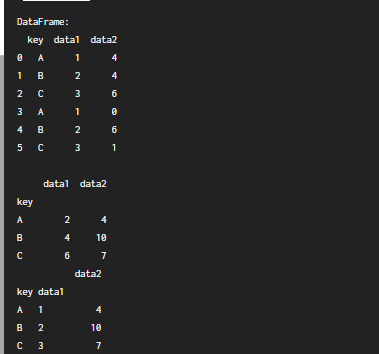 # 데이터 프레임을 'key' 칼럼으로 묶고, data1의 최솟값, data2의 합계를 출력하세요.