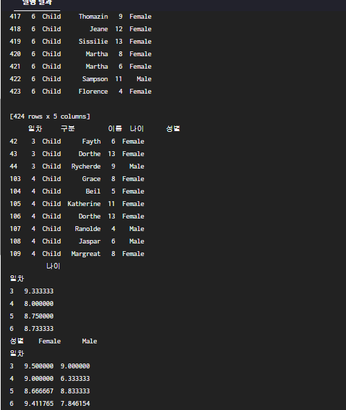 print(children.pivot_table(index='일차', columns='성별', values='나이', aggfunc=np.mean))