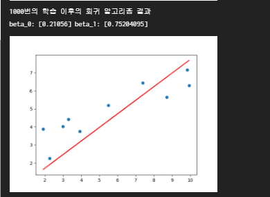 print("{}번의 학습 이후의 회귀 알고리즘 결과".format(iteration))