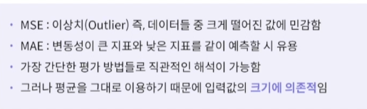 실제값과 예측값의 오차의 절대값의 평균, 작을 수록 성능높