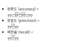 정밀도(Precision) : 모델이 Positive라고 분류한 데이터 중 실제로 Positive인 데이터 비율